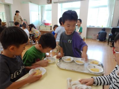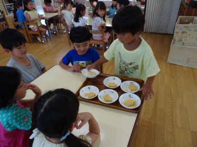 枝豆・ミニトマトはそれぞれ数を数え、枝豆はゆり組さんが2つずつ持ち帰ることに。