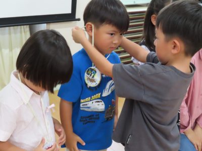 ゆり(年長)組さんが作ってくれたプレゼント(ペンダント)をかけてもらいます。