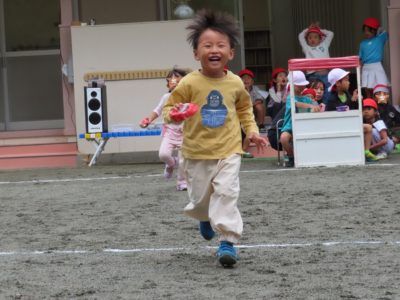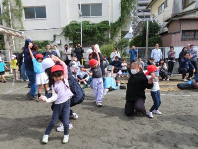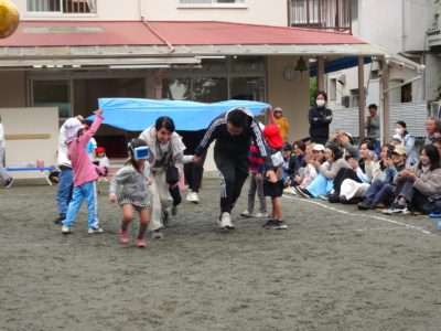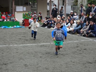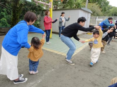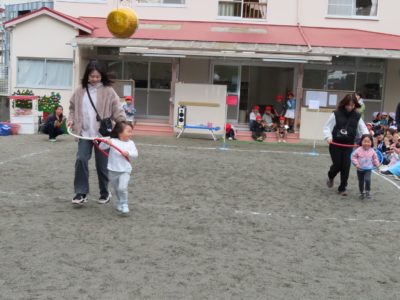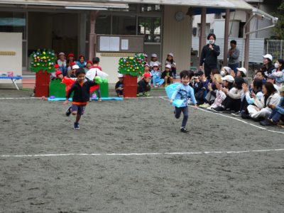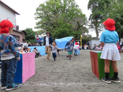ゆり組親子「リレー」ポールを回ったら、大人はスキップ!いい勝負でした。