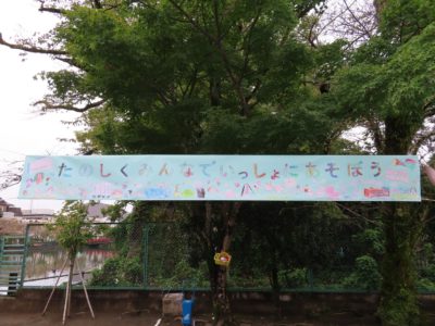 スタートの看板は、ゆり組さんの依頼を受け、はと(年中)組さんが作ってくれました。