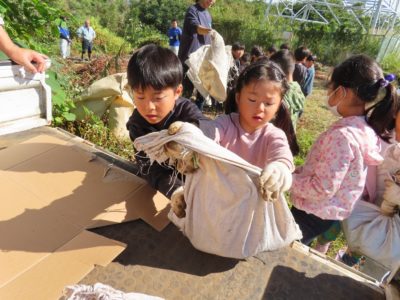 ゆり組さんが畑からお芋をトラックまで運び、幼稚園に着くと園庭に運んでくれました。